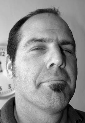 If you’ve ever seen a picture of yourself and thought “that really doesn’t look like me” one reason might be that the photographer used a lens that was too short. In Figure 4b, notice that, just as in our street scene, the sense of depth is greatly reduced, while in Figure 4a, the sense of depth has been stretched so that the man’s ears appear much farther back, his nose seems longer, his eyes spaced different. (In addition, in Figure 4b, notice that the telephoto scene has brought the clock much closer.)