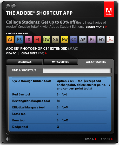 The Adobe Shortcut App is a free rich Internet application that gives you easy access to keyboard shortcuts in twelve programs that are in Creative Suite 4: