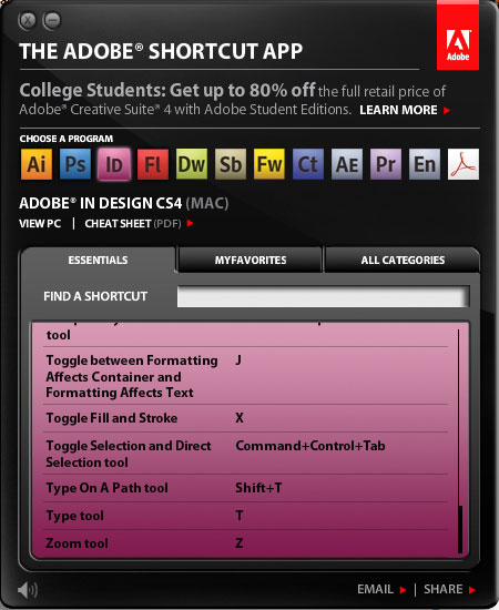 The Adobe Shortcut App is a cross-platform Adobe AIR application that lets you quickly locate any default keyboard shortcut for Photoshop, Illustrator, InDesign, Flash, After Effects, and a bunch of other Adobe applications. (InCopy, Adobe’s red-headed stepchild, is left out.) The Adobe Shortcut App runs on Mac or Windows, but provides keyboard shortcuts for both platforms. You can save favorite shortcuts to the Favorites tab for even faster location later.
