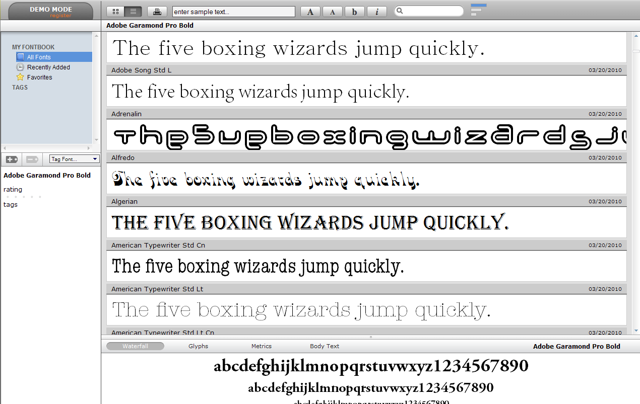I’m constantly impressed with the level of sophistication and utility developers can build into Web-based applications these days. Take MyFontBook, for example. It displays all the fonts installed on your system, complete with glyph tables, metrics, and customizable sample text. You can tag and rate your fonts and even print specimen sheets. And, again, all of this from within a Web browser — no need to install software. And it does it faster than the commercial best-of-breed font management software installed on my computers!