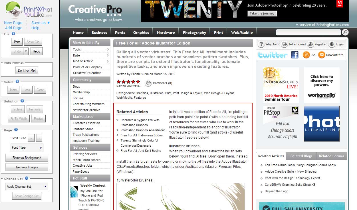 The Dutch company Spranq released the Ecofont technology two years ago. More current news is an easy way to use fewer pages when printing online materials. PrintWhatYouLike.com enables you to instantly and easily print only portions of Web pages, leaving out ads, sidebars, headers, and anything else you don’t want. You can even remove inline or background images.