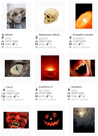 I’ve selected 120 themed images from the free (and royalty free) stock photography site, Stock.xchng. After signing up for a free Stock.xchng account, log in and visit my Halloween lightboxes for an eclectic mix of creepy and corny, objects and backdrops, humans and inhumans, candy and corn, and a pumpkin full of more. Just click on each desired image to access its download options as well as related photos from the same artist.