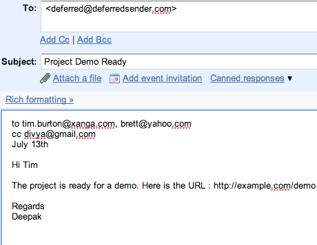 Simply create an account on Deferred Sender, then write the e-mail you want sent at a later time in your normal e-mail client. Add the recipient list and time to send above the main e-mail content, and send it to your Deferred Sender account; the service will then hold the main message until the correct date and time arrive, and then distribute it to your recipients.