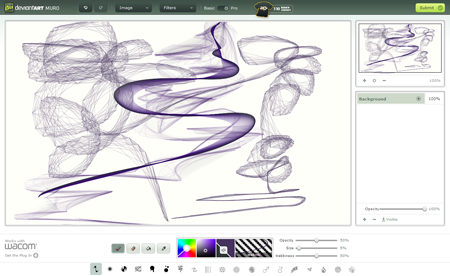 Muro from DeviantArt.com is a painting application with a twist. This browser-based HTML5 painting app lets you instantly create Spirograph-like strokes in any shape or direction. The app offers a full color palette; precision brush controls for tip opacity, size, and intensity; and pressure sensitivity (although that requires a Wacom tablet). Switch to Pro mode via the easily missed control at the top and you can work in multiple layers, which are crucial as you explore the just under two-dozen photo filters built into Muro. Seven brush tips/effects come standard with Muro for free. Another 12 are available for purchase using DeviantArt points, which you can earn through different uses of DeviantArt.com or buy using legal currency. When you’ve finished your HTML5-based masterpiece, you can submit it to the gallery in the DeviantArt.com account or export it PNG.