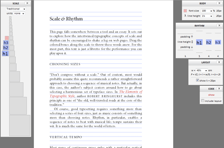 Next, check out the online CSS generator CSS with Vertical Rhythm. For a more visual approach to building baseline grids, try the Baseline Rhythm Calculator, a simple tool that shows you multiple columns and sizes based on single font-size and line-height values. Scale & Rhythm is an even more advanced—and much more visual and interactive—baseline grid calculator.