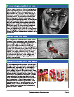 One page of the PDF includes 17 practical keyboard shortcuts for such tasks as “Enter QuickMask mode” and “Drag a layer into another document and have it appear perfectly centered”. The second page is a collection of three mini-tutorials that explain a non-destructive way to convert color images to black and white; how to make one part of a grayscale image pop with color; and how to fill text with a photo: