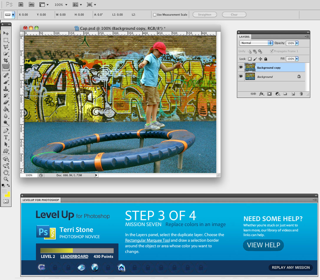 LevelUp is a game from Adobe that you play within Photoshop. The goal is to walk through a series of image-editing tasks and rack up points as you complete each task. For every 400 points you earn, you automatically get one entry into a monthly drawing for the Creative Suite 5.5 Master Collection. This game is definitely worth trying, since the collection retails for $2,599 and earning points is easy. My first 400 took just a few minutes, and I’m no Photoshop expert.