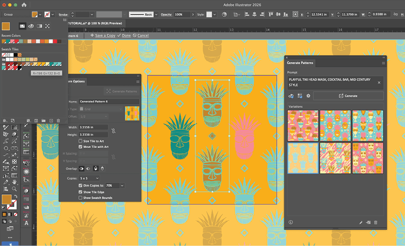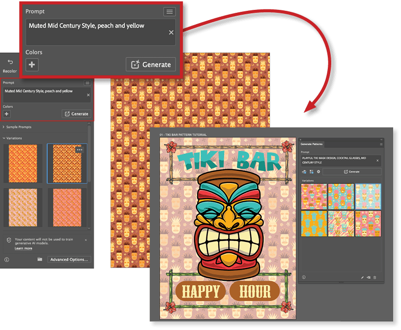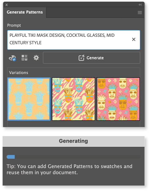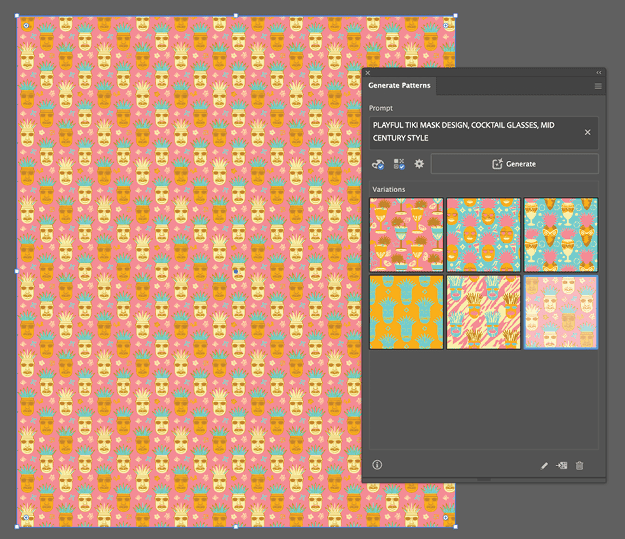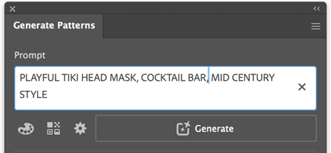 With the basics covered, it’s time to make a pattern. Open the example poster file, then open the Generate Patterns panel using one of the methods described in “Where to Find It.” In the Prompt box, type a simple idea like playful tiki head mask, cocktail bar, mid-century style.