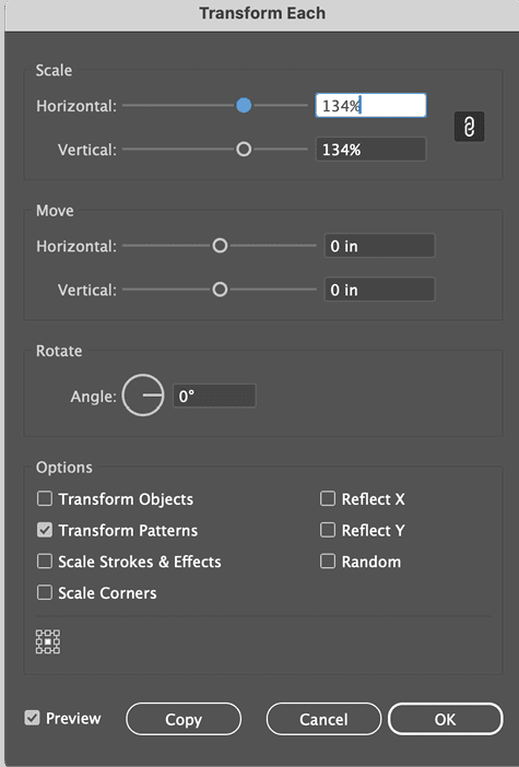 When you find a look you like, click OK. If you want to resize only the shape and not the pattern, reopen Transform Each, turn on the Transform Objects options, and turn off Transform Patterns. It’s fiddly but useful.