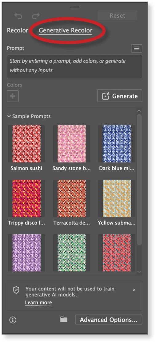 You can experiment with different colors from the swatch set, try different numbers of colors, change the effect, or even change your prompt. Illustrator adds all the patterns you preview or select to the Swatches panel, and if you like, you can create a swatch set from the Swatch panel menu.