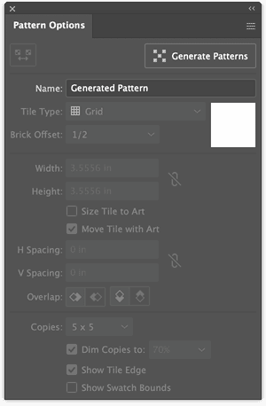 All of these methods open the Generate Patterns panel. It has controls for specifying colors, adding effects, and adjusting the pattern density, and a big Generate button. Clicking the Edit Pattern (pencil) icon at the bottom opens the Patterns Options panel where you can name and adjust your pattern (Figure 2). Even if generative tools are new to you, the process is straightforward, as you’ll see next.