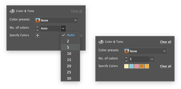 Specify Colors: Click the + icon to add colors from the Swatch panel. You can use any swatch set, but select five colors from the Tiki swatch set for the example. To edit or remove a color, select it, and then make the changes from the Swatch panel. Select Clear All to remove the colors if you want to start again.