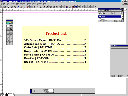 As we discussed previously, the Merge Records operation results in two separate publication files. The original document that is linked to the data source remains intact. The merged publication incorporating all of the live content is no longer linked to the data source. Because the merged publication is a standard PageMaker document, comprising formatted text and imported pictures, you can employ PageMaker’s long-document features to round out the catalog. In Figure 11, for example, we created a simple product list using PageMaker’s automatic table of contents utility.