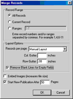 Our sample catalog takes advantage of several powerful features in the Merge Records dialog box. The actual choices we made are shown in Figure 9. Under “Layout Options” we switched to manual layout, to have PageMaker place multiple records on a page. Notice that we’ve specified a vertical gap of .08″ between records. It was not necessary to specify a horizontal gap because our design occupies the full width of the page. We also chose to remove any blank lines that may appear due to empty fields.