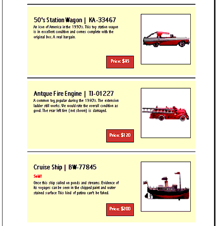 You can see the results of the merge in Figure 10, where three records are placed on each page. Take special note of the first and second entries, where PageMaker has removed what would have been a disruptive blank line under the product name.
