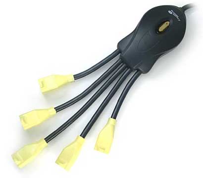 At the office, in your home, in the workshop — everyone has plenty of uses for the Power Squid Outlet Multiplier. Its unique design gives you five outlets where only one existed before. With grounded, adapter-ready outlets, a 4-foot power cord, master switch, and 15-amp circuit breaker, the Squid is eminently practical. And with three color choices (yellow, black, and silver), it’s even a bit ornamental. –Amanda Webber