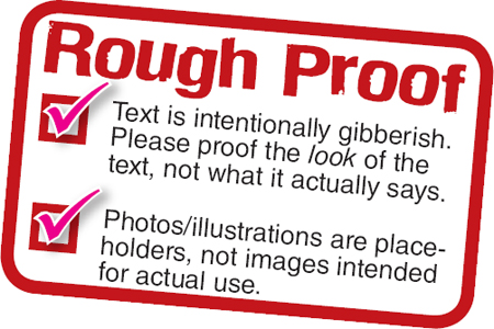 With this new client, a national retail chain that will send my proof to a dozen departments, managers, and executives, a similar misunderstanding might arise. Yet without the layout’s actual copy (still with the copywriter) and imagery (being shot), I’m stuck. While I can try to explain in the e-mail accompanying the PDF exactly how rough the proof is, my warning may not travel as far as the PDF proof. I’d like something inside the proof itself.