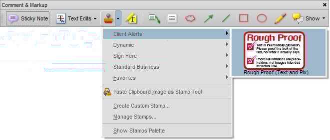 Did I have to use stamps in Acrobat? Couldn’t I have added such information in InDesign? Sure, I could have put the stamp artwork in an InDesign library or snippet — either would have made for extremely convenient reuse in just about any document — but Illustrator, Photoshop, QuarkXPress, Word, Excel, and InCopy can’t add objects from an InDesign library or snippet to a design. My layout, copy, and image proofs come out of various applications, but they nearly always go to the client as PDFs. Keeping the stamps in Acrobat is the easiest way to manage and apply them to proofs no matter where the artwork originates.