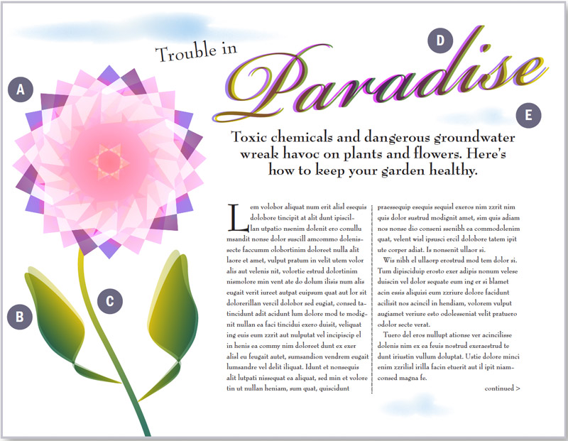 Figure 2: Anatomy of an illustration. (A) Radial gradients combined with various blending modes team up to create this flower. I then grouped the objects and selected Isolate Blending in the Transparency palette to prevent the stem from showing through. B) I used linear gradients for the leaves. I pasted a copy of each leaf in front and offset it slightly, then applied 47% opacity and Multiply mode. C) The stem shows how gradients can be applied to Strokes. D) | applied radial gradients to both headlines. The frontmost text also uses a Multiply blend mode. E) The clouds began as three separate ellipses. Selecting all, I applied the Pathfinder > Add filter to combine the shapes into one. Afterward, I filled the shape with a white to blue radial gradient before applying a 16pt feather with 10% noise. To distort the shape a bit I ran the Bloat effect in the PathEffects Javascript that ships with InDesign. Finally, | Option/ Alt-copied the original cloud twice and transformed it into different sizes and opacities.