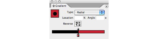 Figure 6: The Gradient palette allows you to numerically control the gradient’s mid-point location and its angle. Click the reverse button to flip the start and end points of your gradient. Here I’ve placed the start and end points directly on top of each other, creating a gradient with no blend between colors. Choosing a Radial gradient in this case produces a dot within a colored field.