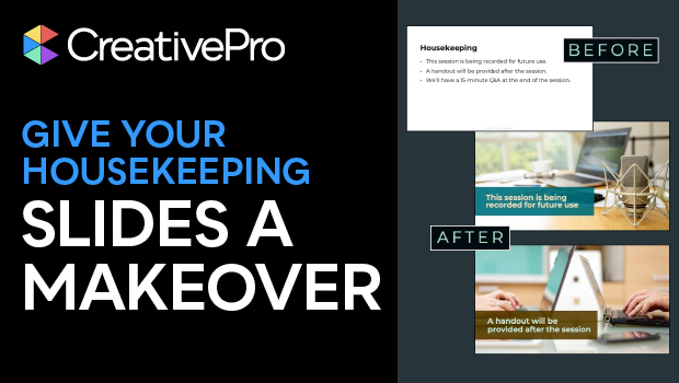 In this presentation design how-to video, Jody Wissing talks about the dreaded housekeeping slide. She shows you how to deliver all the essential info — like timing, breaks, Q&A, and tech tips — without ever uttering the word “housekeeping.” Learn how to naturally weave these details into your presentation in a way that feels engaging, seamless, and participant-focused.