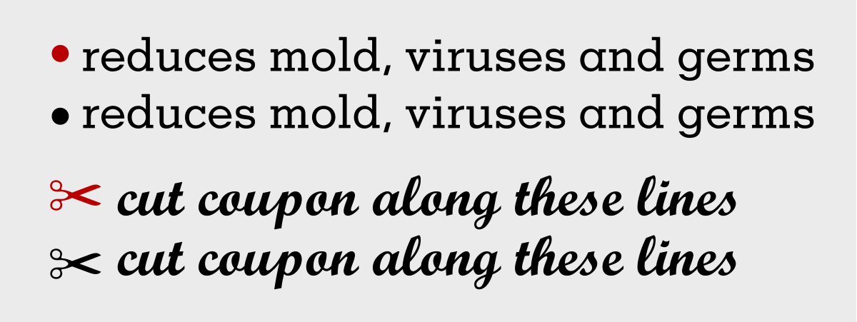 Bullets (and any graphic used for a bulleted list) are a common element in many kinds of text. Depending on what symbol being used, check their vertical placement to make sure they are optically centered next to the majority of points, or wherever you deem is the best placement. Make sure the size is right before you adjust them, and make all of them the same, even if their neighboring glyphs differ.