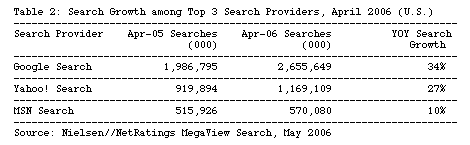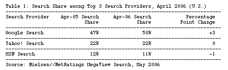 Nielsen//NetRatings, a global leader in Internet media and market research, today announced that Google accounted for 50 percent of all searches conducted in April, followed by Yahoo! and MSN, with 22 and 11 percent, respectively (see Table 1). Year over year, Google gained three percentage points in market share, while Yahoo! remained flat and MSN dipped slightly.