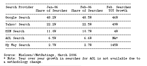 Nielsen//NetRatings, a global leader in Internet media and market research, today reported that Google continues its lead in the search share competition, garnering 48.5 percent of all searches conducted in February 2006 (see Table 1). Yahoo! drew 22.5 percent of online searches, while MSN accounted for 10.7 percent of the search market. AOL and My Way Search rounded out the top five search providers with 6.6 and 2.7 percent of searches, respectively.