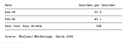 Overall the total number of searches increased 38 percent, from 3.8 billion in February 2005 to 5.3 billion in February 2006. This growth in the total number of searches is due in large part to an increased number of searches per person, particularly in the image search and shopping search categories. In February 2005, the average Web user conducted 33.2 searches; by this February, that number had climbed to 43.1 searches, increasing 30 percent year over year (see Table 2). In contrast, the number of unique searchers increased year over year by a modest six percent.