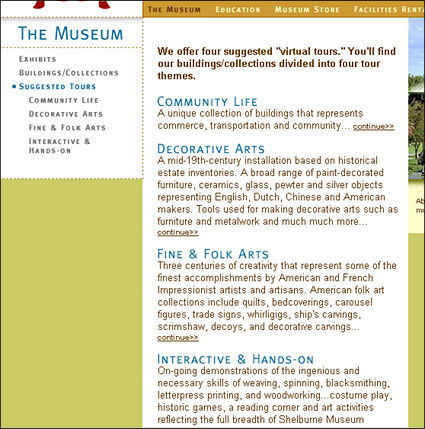 For the Shelburne Museum, the site is a compelling way to show people from afar what the institution has to offer. For the site’s designers, www.shelburnemuseum.org is a an impressive accomplishment. For those of us in the business of designing for the Web, this site offers a welcome example of how to give visitors a good feel for a real-world place without coming off as a pathetically flat and lifeless imitation.