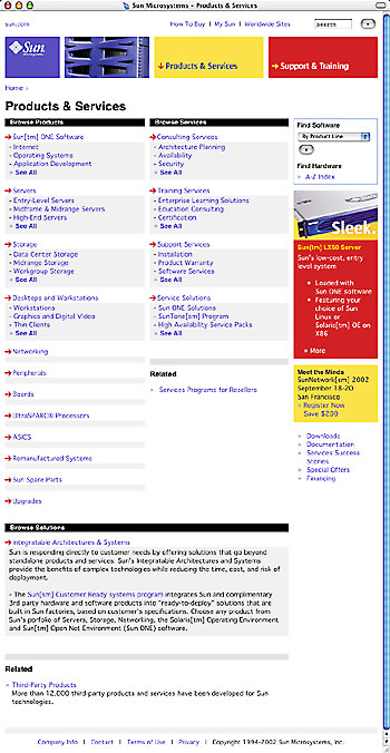 All the graphic identity from the home page is contained within a narrow branding bar across the top of the two divisional navigation pages. The featured items and search field are pushed to a vertical column on the right (see figure 2). The rest is all HTML tables, ASCII text, and CSS style sheets. For instance, within the Products and Services divisional page are two columns titled Browse Products and Browse Services, with a list of sectional links within each subdivision. Each section, indicated by a red arrow, is further subdivided into subsection links and all the text is in Sun-branded purple. It is a straightforward list of links presented in a graphically pleasing, logical fashion.