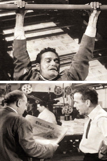 Figure 4: “Deadline USA” stars Humphrey Bogart as a smooth managing editor trying to save a daily paper while also nailing a local mob boss. Scenes include a murder in the pressroom as a local gangster falls into the running press (top).