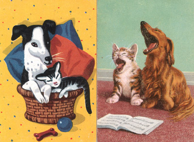 Figure 8: Cats and dogs are frequently pictured together, despite a natural dislike for each other. These illustration and photos are from playing cards.