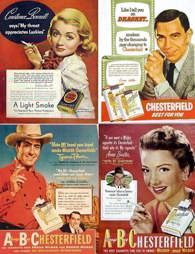 In 1951, manly John Wayne was promoting the mild nature of Camel cigarettes. Before he eventually died of lung cancer, Wayne went back on the television airwaves on behalf of the American Cancer society to put in a good word for quitting.