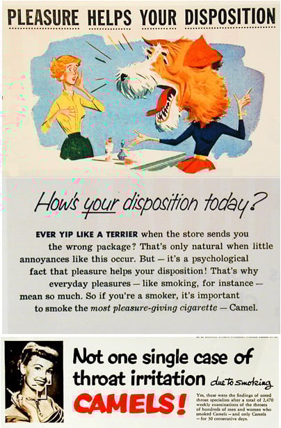 In 1956, cigarette companies were still promoting smoking as a remedy to tense nerves and as a way to avoid “yipping like a terrier,” as in this ad for Camels. Because of FTC rules regulating the direct claim of medical benefits, Camel made the indirect link between smoking pleasure and a more pleasing disposition. Below, Camel’s famous T-Zone philosophy, which held that Camels, “and only Camels” caused no throat irritation even after 30 days!