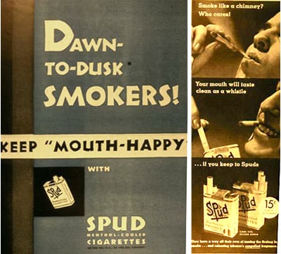 Spud Cigarettes, a popular brand from Phillip Morris, was advertised here in 1935 as the cigarette for heavy smokers, and at one time claimed that smoking even three-packs a day could be achieved without ill effects, and all the time keeping your “mouth happy.”