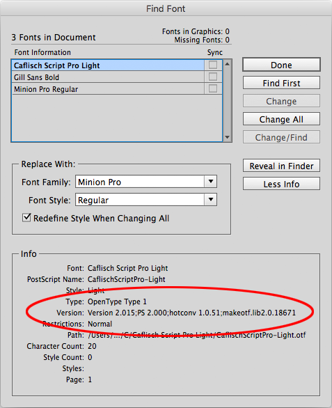 (Windows). But there’s an even easier way, from within InDesign: Choose Type > Find Font, and then choose the font from the list of fonts used in your document, and then click the More Info button (Figure 1).