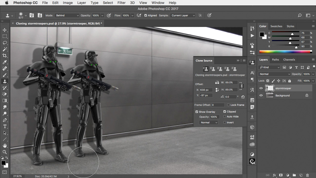 Move the cursor to where the next Stormtrooper’s shadow should begin and click once to start the process. You’ll see the beginning of the new Stormtrooper in place. Check the Clone Source panel: the Show Overlay checkbox should be checked already, as well as the Clipped checkbox when means you only see the overlay at the current brush size.