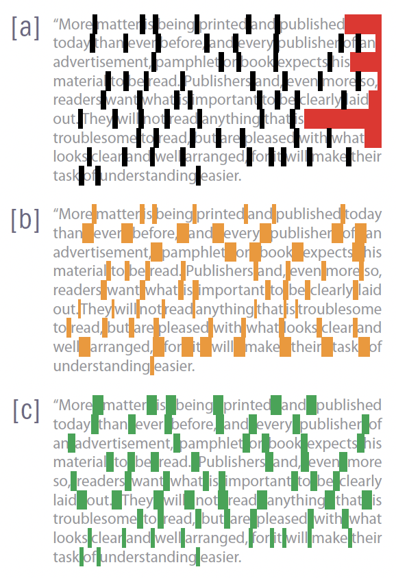 Figure 2: The same paragraph aligned left [a] and justified using the Single-line Composer [b] and the Paragraph Composer [c]; hyphenation is turned off. The default justification settings allow for a 80-percent decrease and a 133-percent increase in Word Spacing.