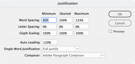 Figure 4: The Justification window lets you determine a minimum, desired, and maximum range (expressed in percentages), which can be used to choose break points within lines of text when it’s justified.