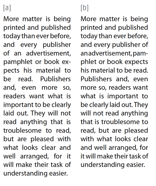 More matter is being printed and published today than ever before, and every publisher of an advertisement, pamphlet or book expects his material to be read. Publishers and, even more so, readers want what is important to be clearly laid out. They will not read anything that is troublesome to read, but are pleased with what looks clear and well arranged, for it will make their task of understanding easier. For this reason, the important part must stand out and the unimportant must be subdued… The technique of modern typography must also adapt itself to the speed of our times. Today, we cannot spend as much time on a letter heading or other piece of jobbing as was possible even in the nineties. -Jan Tschichold, Asymmetrische Typographie, 1935 These words could have been written today although, a century later, we tend to refer to our nineties as the dark ages of text composition. Until page-layout applications took over computer desktops, setting text and fine-tuning typographic details were left to highly skilled typesetters. Many graphic designers continue this legacy when they consider body text to be merely gray matter that fills the space in between page margins. The quality of typeset text is judged by its texture and readability. An even texture is essential for readability, whether your graphic style is classical, modern, or post-modern. The right combination of typeface, point size, leading, kerning, hyphenation, and line length results in a page that has an even texture and is not only pleasing to look at but, more importantly, pleasing to read (Figure 1).