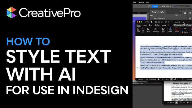 In this AI how-to video, Melissa Piccone demonstrates how to use ChatGPT to clean up messy Word documents, leaving you free to focus on design. She prompts ChatGPT to recreate her Word document of copy suggestions using custom Word styles that align with her InDesign Paragraph Styles. Then, she drops the text into InDesign, fixes any AI-generated errors, and her design is ready to go.