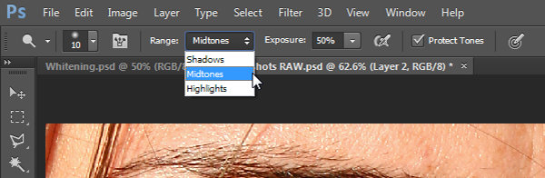 On the Options bar, set the Range dropdown to Midtones and the exposure to 50%. The Dodge Tool lightens things, and the Range field determines what it lightens—the lightest tones (Highlights), the darkest tones (Shadows), or those tones that fall in the middle third (Midtones), which are the most common tones to be affecting teeth and scleras.