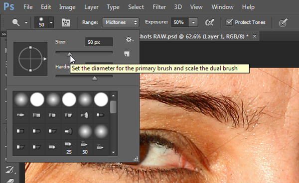 On the Options bar, set the Range dropdown to Midtones and the exposure to 50%. The Dodge Tool lightens things, and the Range field determines what it lightens—the lightest tones (Highlights), the darkest tones (Shadows), or those tones that fall in the middle third (Midtones), which are the most common tones to be affecting teeth and scleras.