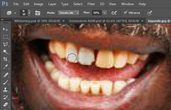 Sometimes the conditions of the photograph—or the subject himself or herself—causes a yellowing, sometimes even a bluing, of the teeth or scleras. In such cases using a dodge effect will only often simply highlight the yellow (or blue) rather than neutralizing it. To compensate, you’ll need to desaturate the color cast before using the Dodge Tool. Use the Sponge Tool just like you would the Dodge Tool, painting over the tinted whites with the Options bar Mode field set to Desaturate. Keep using the Sponge Tool in Desaturate mode until the teeth and scleras are colorless, showing only shades of grey. Then switch to the Dodge Tool for lightening those shades of grey.