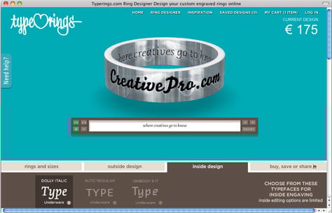 The website’s Ring Designer lets you play with typeface and size on all of the available materials. As the screenshot below demonstrates, inscriptions can be on both the inside and outside of your ring: