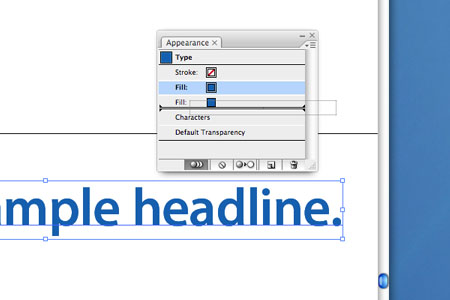 7. With the line of type still selected and the new Fill selected in the Appearance panel, open the Swatches panel or the Color panel and select a new fill color. I’ll choose a blue CMYK mix of C=85%, M=50%. You’ll see that the Fill attribute in the Appearance panel has changed to the color you just selected or created.