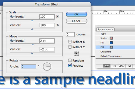 10. Now let’s offset the gray shadow. With the headline still selected with the Selection Tool, and the gray Fill selected in the Appearance panel, go to Effect > Distort & Transform > Transform. That brings up the Transform Effect dialog box, which has three options: Scale, Move, and Rotate. In the Move Horizontal field enter 2 pts, and in the Move Vertical field enter -2 pts (negative two points). This will produce a classic drop shadow that’s shifted to the right and down from the headline (Figure 5). Click the Preview button to check the settings, leave the rest as is, and then click OK.