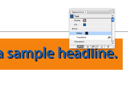 Don’t like the fill or stroke color? Select it in the Appearance panel and change the color value in the Colors or Swatches panels. Is the stroke to thin or thick? Select it in the Appearance panel and modify the weight in the Stroke panel. Need to change the offsets? Select the Transform layer in the Appearance panel and modify the Move fields. Need to correct a typo in the head? Use the Type tool and make your correction to all three layers at once — not to three separate lines of type.