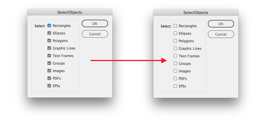 As useful as the SelectObjects script is, it still could be more user-friendly. When you run the script all the options in the dialog are selected.